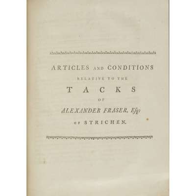 12) [Fraser, Alexander.] Articles and conditions relative to the tacks of Alexander Fraser, Esq; of Strichen. [Aberdeen? 1781?] 4to, 14 pp., [ESTC: ABu. The same copy is listed in Copac and WorldCat]