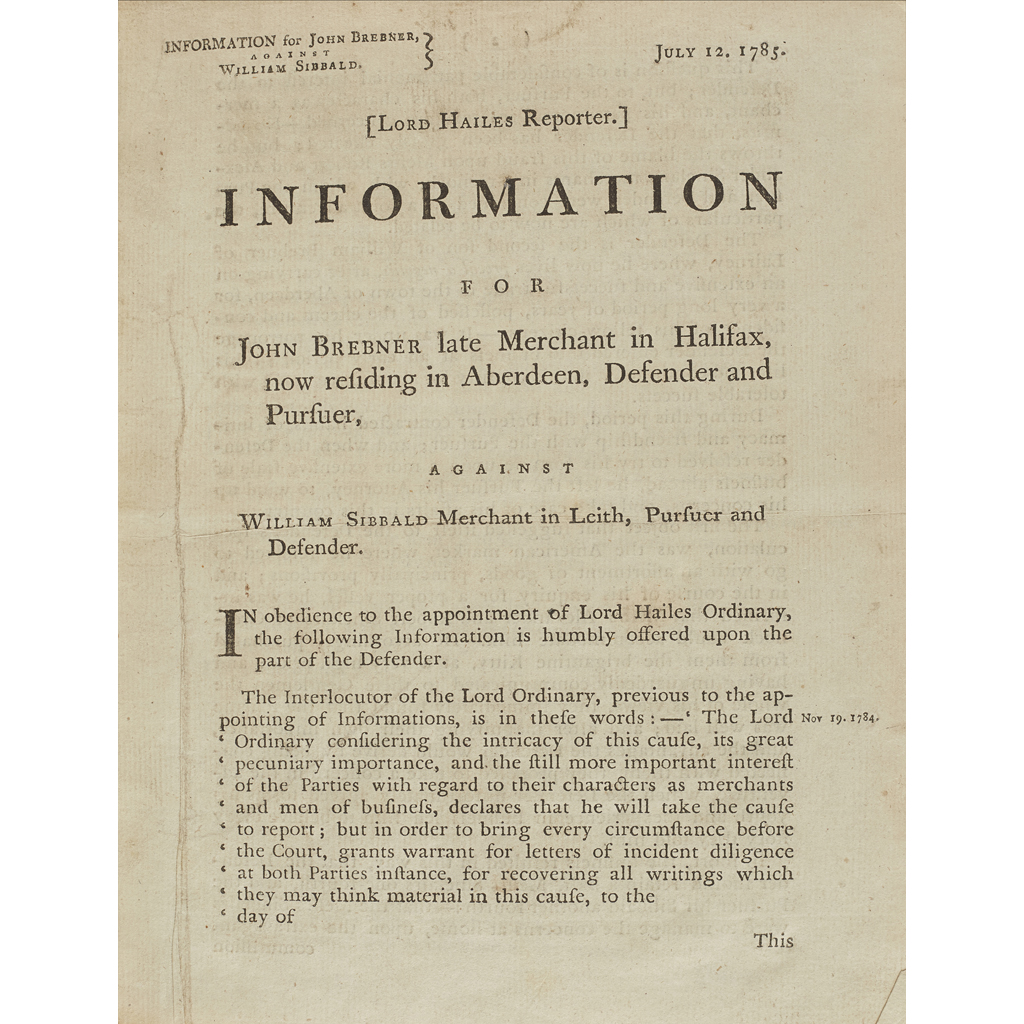 1) [Brebner, John: deposition.] [Caption title:] Information for John Brebner late merchant in Halifax, now residing in Aberdeen, defender and pursuer, against William Sibbald, merchant in Leith, pursuer and defender. [Edinburgh: 1785.] 4to; 33(1); 16 pp.; dated at the top: July 12, 1785. Lord Hailes, reporter. Unrecorded