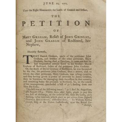 10) [Forbes, Sir William, James Hunter and Company.] [Caption title:] Unto the Right Honourable the Lords of Council, the petition of Sir William Forbes, James Hunter, and Company, bankers in Edinburgh. [Edinburgh: 1788.] 4to; 21 pp.; dated at the top of the first page, February 29, 1788, Forbes's own copy. Unrecorded