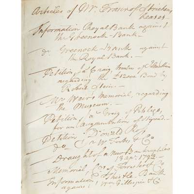 7) [Erskine, Sir William: deposition.] Reports and exhibits in the process, Sir William Erskine, &c. against Robert, Henry, &c. Drummonds, Esqrs.. [Edinburgh: 1786.] 4to; (2), 75 pp. Unrecorded