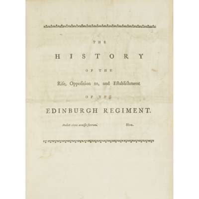 5) [Anon.] The history of the rise, opposition to, and establishment of the Edinburgh Regiment. [Edinburgh: 1778.] 4to; 18, 2 pp., dated on p.18: Edinburgh, January 24. 1778. Includes a supplement, with separate pagination, dated: January 29. 1778, ESTC, 7 copies]