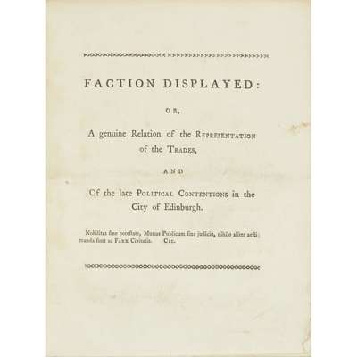 6) [Stuart, Gilbert.] Faction displayed: or, a genuine relation of the representation of the trades, and of the late political contentions in the city of Edinburgh. [Edinburgh: 1777.] First edition, 4to; 25 pp., [ESTC: 4 copies]; 6 works in one volume, 4to, contemporary half calf, red morocco label "Miscellanies", numbered "53" in gilt on spine, bookplate of Sir William Forbes Bart. of Pitsligo