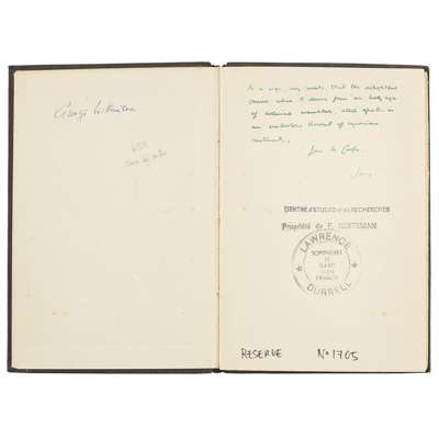 Transition: Poems. London: The Caduceus Press, 1934. First edition, 8vo, inscribed "it's a sign, my sweets, that the delightful genius which I derive from an holy age of colonial warblers, still spates in an unbroken torrent of capricious continuity. Love to Corfu, Larry", with stamp "Centre d'Etudes et de Recherches. Propriété de F. Kestsman. Lawrence Durrell, Sommieres 15 Gard 30250 France" and name "George Wilkinson" in another hand, original black boards with lettering label on upper board