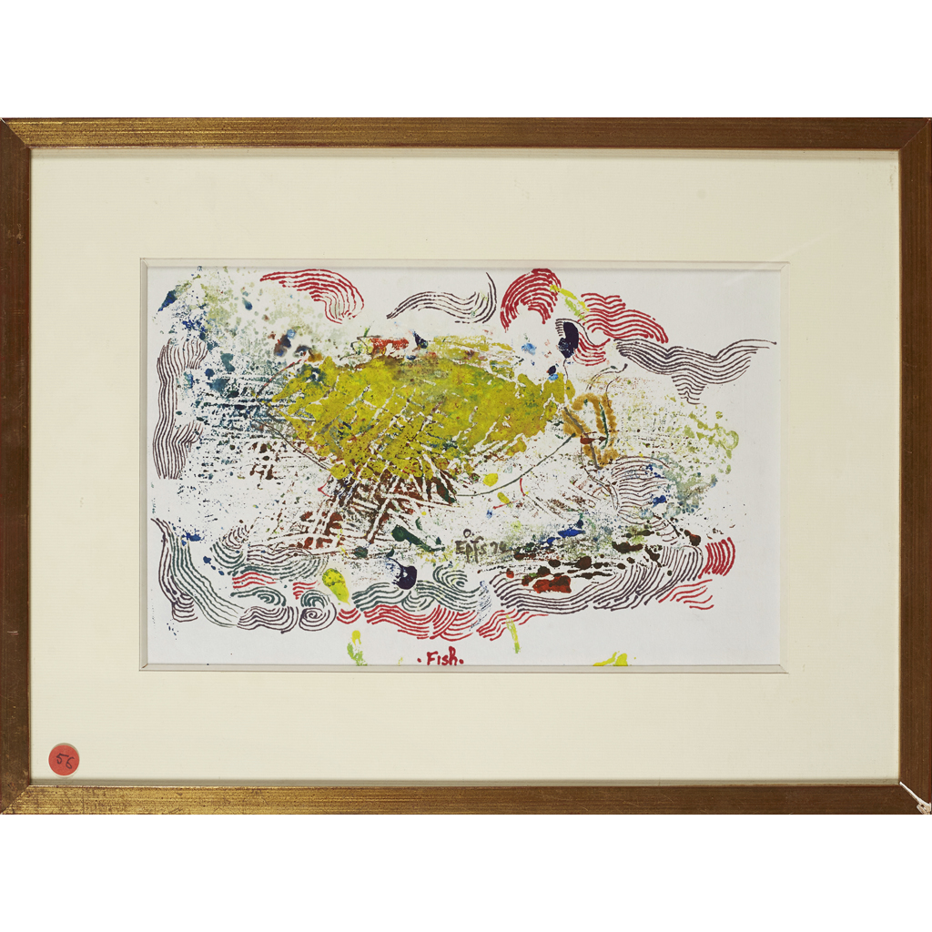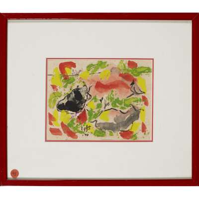 i) ['Easter golden fish from Crete'], c.195 x 305mm, ink, gouache and watercolour, signed ("Epfs") and dated 1974, framed and glazed (338 x 453mm), numbered 56, ink stamp ("Lawrence Durrell | Sommieres [etc]"), inscribed ("propriété de Francoise Kestsman-Durrell"); ii) ['Little bulls asleep in the meadow'], c.145 x 190mm, gouache and watercolour, signed ("Epfs") and dated 1970, framed and glazed (313 x 360mm), numbered 43, ink stamp ("Lawrence Durrell | Sommieres [etc]"), inscribed ("propriété de Francoise Kestsman-Durrell")
