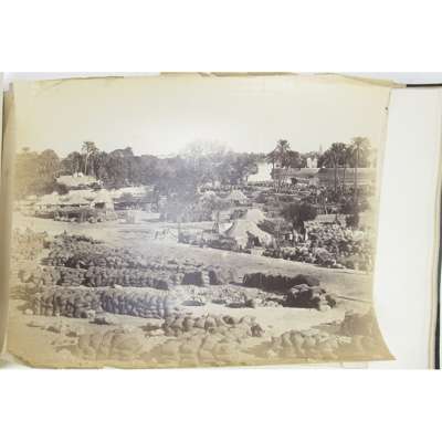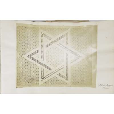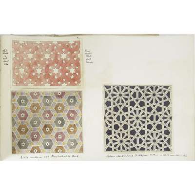 album containing 28 leaves with laid-down watercolour and hand-drawn copies of patterns found in Mughal design, including "Latticed shutter Cashmere [sic.]", "[decoration from] Saleem Chisti's [sic.] tomb" and "White marble latticed screen...Tomb Agra"; also with a loosely inserted manuscript on Government of India blindstamped paper detailing the "Arrangement of a simple caponier", dated 07/06/78; also with four loosely inserted watercolour illustrations: three showing landscapes and one showing a local man; also with four loosely inserted albumen prints showing Indian landscapes, and several photographs of Roman interior decoration pasted to initial leaves