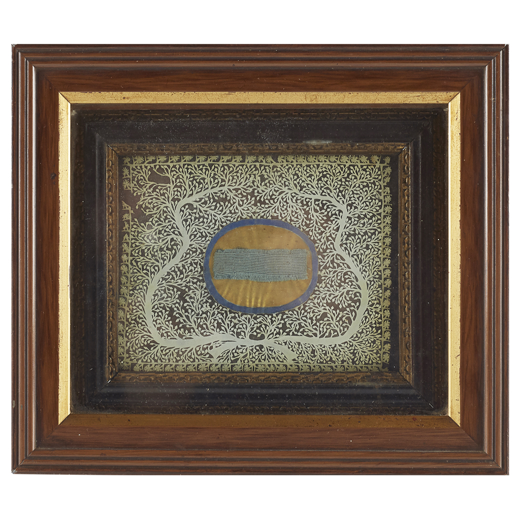 CONTAINED WITHIN A FRAME, SURROUNDED BY A DECORATIVE FOLIATE CUT PAPER DESIGN,