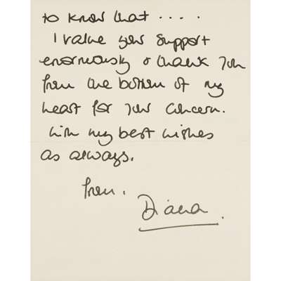"Thank you both so much for writing to me - the Contents of your letter brought a great deal of comfort & I did want you both to know that I value your support enormously & thank you from the bottom of my heart for your concern. With my best wishes as always", 2pp. on Kensington Palace headed paper printed in red, in original registered envelope, the name and address and initial D in Princess Diana's holograph