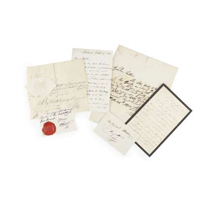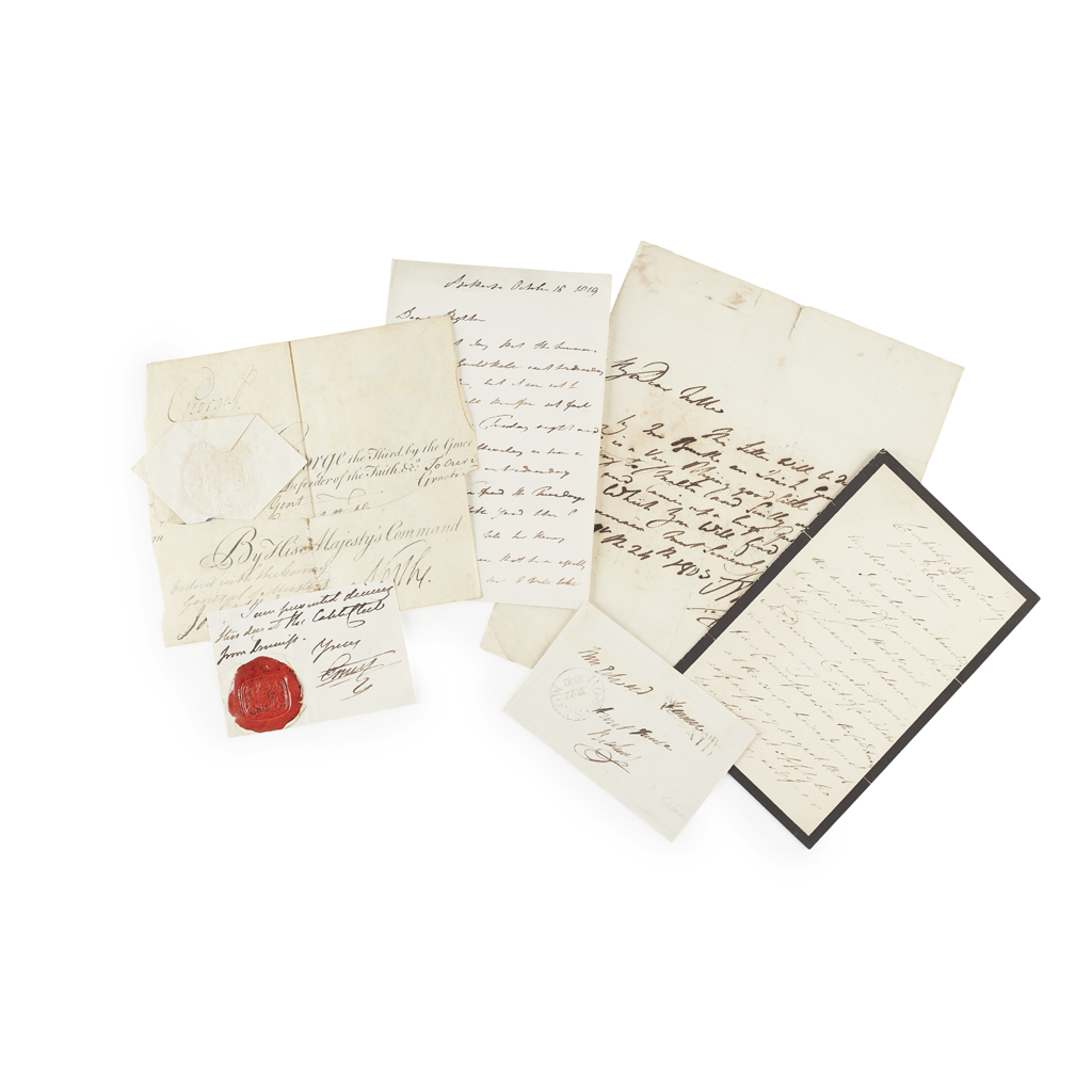 Frederick, Duke of York (1763-1827, 2nd son of George III, Commander in Chief of the Army), Autograph Letter Signed to Francis Dighton, clerk in the Commander in Chief's Office, Horse Guards, signed "Frederick", 16 Oct. 1819; Ernest Augustus, King of Hanover, 5th son of George III Brief A.N.S. on piece 7 x 10cm., with seal, & Envelope addressed to Lord Archbishop of Canterbury, and initialled, 10 x 13cm; Augustus Frederick, Duke of Sussex (1773-1843, 6th son of George III) Free front, 1837, addressed and signed ("Sussex") by him, 7 x 11cm.; & Autograph Letter Signed ("Augustus Frederick"), to my dear Miller, recommending an Irish salesman of Cask Wine, London, 7th the 24th 1805, 23 x 19cm.; Adolphus Frederick (1774-1850, 7th son of George III), Autograph letter signed to "My dear Lord", regarding Mr Deine's desire for a Commission in the Coldstreams Guards, Cambridge House, Jan 26 1840, 3pp., small split at fold; Prince William Frederick, Duke of Gloucester and Edinburgh, son-in-law of George III Address panel addressed to Her Royal Highness the Duchess of Gloucester, signed "William Frederick", 29 August 1824; Princess Mary, Duchess of Gloucester, daughter of George III Third Party letter, n.d. (c.1822), arranging a visit by Miss [Elizabeth] Fry, 1p; Princess Sophia (1777-1848, daughter of George III), envelope front 1842, addressed in her hand and signed with her florid initial; Princess Elizabeth, daughter of George III, married Frederick IV Landgrave of Hesse Homburg Envelope address by her, mounted on card; Augusta Sophia (1768-1840, daughter of George III) Autograph letter signed to "My dear Taylor", Jan. 1826 1830, cut close touching a few letters; George Duke of Cambridge, (grandson of George III), Autograph Letter Signed to John B. Heath, Director of the Bank of England, regarding promotion for one George Brown, St. James's Palace, Aug. 10 1859, 3pp.; George IV, King of England, (1738-1820) Autograph envelope (unsigned) as Prince Regent, addressed to the Earl of Bessborough (12)