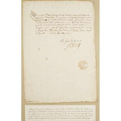 addressed to "Mon Frere" [a Duke ?], and concerning a gift of various lands, 1/2p. with integral address panel and seal mark, folio, tipped onto an old album leaf at left hand margin, with neat biographical caption in English pasted to mount beneath, together with an uncoloured litho. portrait of the King (marginal spotting) pasted onto a matching album leaf (2)