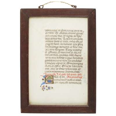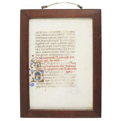 a total of 40 lines of text, 270 x 190mm, framed and double-glazed, rubricated, with three illuminated initials including one featuring three king figures