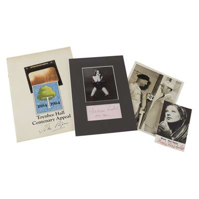 signed, War Office headed paper, 28 Feb. 1962, photograph of Christine Keeler by Lewis Morley with separate signed autograph dated Dec. 1991; signed photograph of Valerie Hobson, wife of John Profumo, signed photograph postcard of Mandy Rice Davies, Toynbee Hall Centenary Appeal signed by John Profumo, typed letter (not signed) to John Profumo as Chairman of Toynbee Hall from Elizabeth II, 28 Jan. 1984; Typed messages from Lambeth Palace and 10 Downing Street celebrating 100th birthday of Toynbee Hall; Reproduction portrait of Harold Macmillan signed by Macmillan, newspaper Headline clipping announcing Stephen Ward's death; Practising Certificate of the State Board of Osteopaths of Missouri, of Dr. Stephen Ward which hung in his Harley Street office