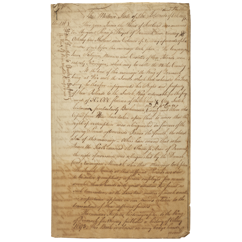 a 22 page manuscript detailing the history of Orkney and Shetland from 1468 until the early seventeenth century, 316 x 188mm, with no author stated but written in a late eighteenth or early nineteenth century hand, some browning; [Another copy] 16pp. only, in the same hand, attached to a 10pp. manuscript entitles of the Ancient History of Orkney and Shetland (2)