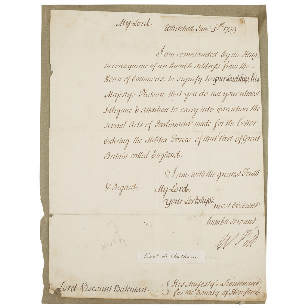 Lieutenant of the County of Hereford, 1p., small 4to, Whitehall, 5th June 1759, "I am commanded... to signify to your Lordship... that you do use your utmost Diligence & attention to carry into execution the severall Acts of Parliament made for the better Ordering the Militia Forces of that Part of Great Britain called England", folds, mounted