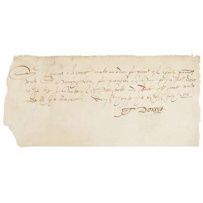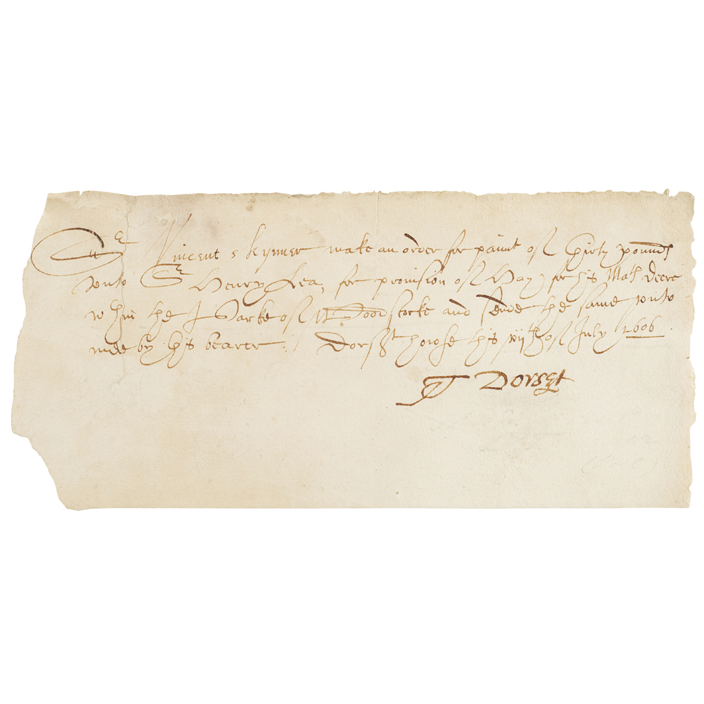 a warrant ordering the payment of £30 to Sir Henry Lee for the provision of hay for His Majesty's deer in Woodstock Park, Dorset, July 1606, 8 x 17cm., irregularly torn to two edges, tear affecting part of the text professionally repaired