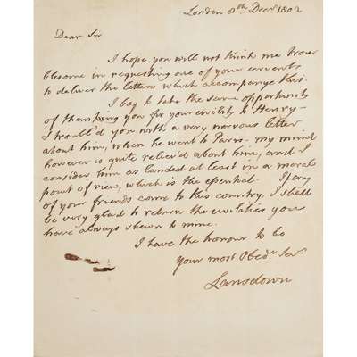 on personal affairs, 1 page, 4to, London, 8 Dec. 1802 "thanking you for your civility to Henry - I troubled you with a very nervous letter about him when he went to Paris - my mind however is quite relieved about him, and I consider him as landed at least in a moral point of view"