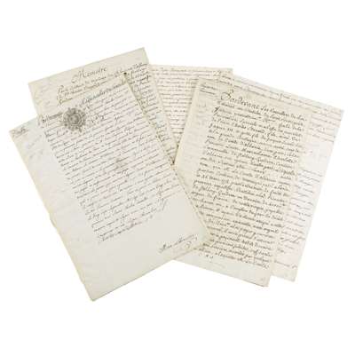 a total of 27pp., small folio, four in French, one in French & Italian, one in Italian, one signed by Charles Edward Stuart as "Charles Comte d'Albanie" in two places in his later shaky hand. The signed and most significant document is described as follows in HMC, x.238 (Lord Braye's MSS, the Stuart MSS): September 27, 1786. Rome. Original power in French executed by Charles Edward before the Chancellor of the French Consulate at Rome to M. Busoni, empowering him, in presence of or acting with the advice of Mons. J.B. Vulpian, to execute along with the Countess of Albany or her representative the agreement whereof a draft is subjoined. Signed "Charles Comte d'Albanie", seal of French consulate at Rome affixed, executed in duplicate. The draft agreement after reciting the securing of the jointure of 40,000, and the pin-money of 12,000 livres by the marriage contract upon the first subsidies received by Charles Edward, the letter of April, 1772, the letter of separation of April 3, 1784, the grant by Louis XVI of a pension of 60,000 francs to the Countess of Albany and of the same sum to Charles Edward, and the claim of the Countess to the jointure of 40,000 secured by the contract in addition to the pension of 60,000 francs, whereas her husband contended that the contract had been satisfied by the grant of the pension, witnesses that the Countess agrees to accept a reduced jointure of 20,000 livres charged on all the property of her husband, and redeemable at any time after a year from his decease at her option for 500,000 livres.