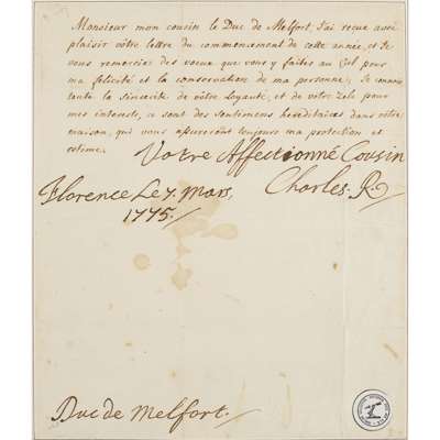 LETTER SIGNED ("CHARLES R.") AND SUBSCRIBED TO THE DUKE OF MELFORT, IN FRENCH.