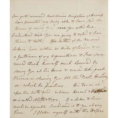 (no opening salutation, but probably to the Prussian Ambassador) concerning the author of the Farmers Letters, 2pp., May 20th 1769, integral blank, "the Author of the Farmers Letters lives within 20 miles of London & is a Gentleman of my Acquaintance" and offering to arrange a meeting, "if through your observations in this County agriculture should receive any advancement in Prussia"