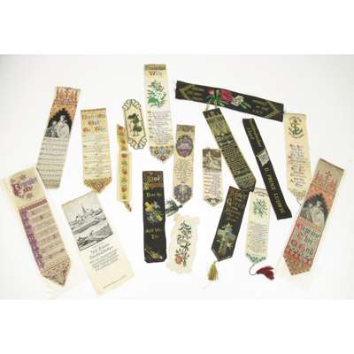Note: The highlights of this group of bookmarks may be the 20 Stevengraphs - woven silk bookmarks with designs developed by Thomas Stevens of Coventry in the 1860s and 1870s. Coventry was known for its woven silk ribbon industry, which is reflected in one bookmark woven with Tennyson's Godiva and motifs of Lady Godiva and Peeping Tom. The collection also includes Stevens's Remember Me marker, The Old Arm Chair and We promise Thee O God alongside others, many with religious themes.