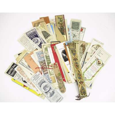 a hand cross-stitched bookmark, 153 x 35mm, celebrating the alliance of the Ottoman, French and British troops during the Crimean War, with the motto "may they ever be united", c.1854; a hand-painted silk bookmark with holly, berries and 'Merry Christmas', 236 x 41mm; an early Victorian advertising bookmark, with a calendar for 1880 to the reverse, for Brown & Polsons patent cornflour, 191 x 51mm; a paper découpage bookmark showing a vase of tulips, 162 x 53mm; 16 Scottish Widows' Fund bookmarks specially designed by Walter Crane; 37 woven, embroidered or printed bookmarks often in silk; and a large quantity of card and leather bookmarks, including many advertising markers; Coysh, A.W. Collecting Bookmarkers, 1974 (c.375 markers)