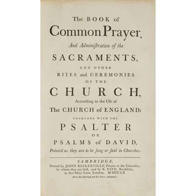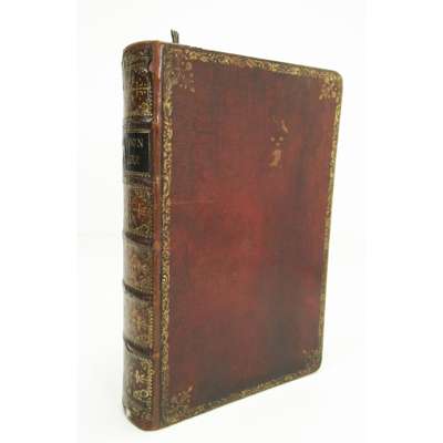 Cambridge: John Baskerville for the University, 1760. Large 8vo, contemporary red morocco with Baskerville floral gilt border, bound by binders working for Baskerville, spine gilt and neatly rebacked, Baskerville's own colour-wash marbled endpapers, some very minor dampstaining towards the rear of the work, occasional light foxing, covers very slightly rubbed, bookplate of Geoffrey Lord Cross of Chelsea [Gaskell 12, without borders; ESTC T81395]