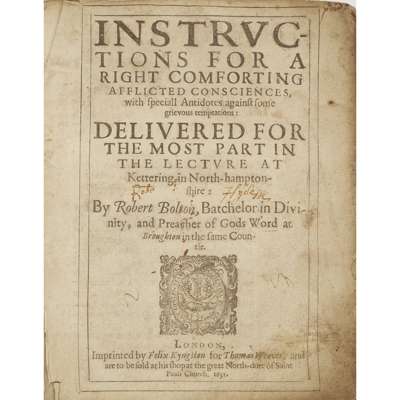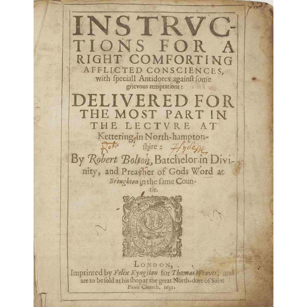with speciall Antidotes against some grievious temptations, delivered for the most part in the Lecture at Kettering in North-hamptonshire. London: Felix Kyngston for Thomas Weaver, 1631. First edition, 4to, collates: [26], 560, signed "Robt. Hyde" on title page, "Ann Hyde, Her Booke" on title verso, contemporary vellum, title lightly dust-soiled, front free endpaper torn and loose, K5 with marginal tear, binding somewhat soiled, [STC 3238, ESTC S106257]