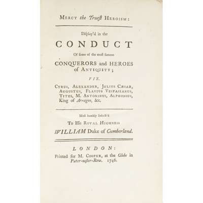 1) Mercy the Truest Heroism: Display'd in the Conduct of some of the most famous Conquerors. London: M Cooper, 1746. 8vo, 23pp., [ESTC: 7 copies in UK, 1 in N. America]