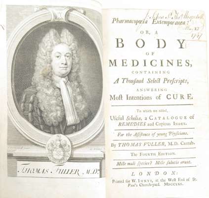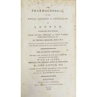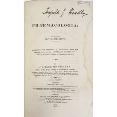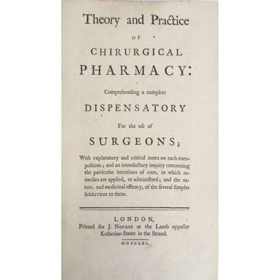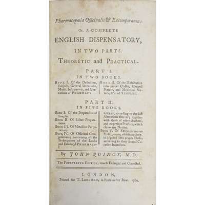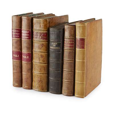 Pharmacopoeia Extemporanea: or, a Body of Medicines... London: W. Innys, 1730. Fourth edition, 8vo, portrait, contemporary calf, neatly rebacked, bookplate, a few early notes, covers a little rubbed [ESTC T138946]; [Dossie, Robert] Theory and Practice of Chirurgical Pharmacy... London: J. Nourse, 1761. 8vo, contemporary calf with red morocco gilt label to spine, bookplate [ESTC T148841]; Quincy, John Pharmacopoeia Officinalis & Extemporanea: or, a Complete English Dispensatory... London: T. Longman, 1769. Fourteenth edition, 8vo, contemporary calf, neatly rebacked [ESTC T61387]; Healde, Thomas The Pharmacopoeia, of the Royal College of Physicians of London. London: T. Longman, 1796. Seventh edition, 8vo, with final advert leaf, contemporary calf, neatly rebacked [ESTC N11349]; Paris, J.A. Pharmacologia... London: W. Phillips, 1825. Sixth edition, 2 volumes, 8vo, modern half calf, the 'Medicinal Dynameter' lacking the original volvelle, some dampstaining (6)