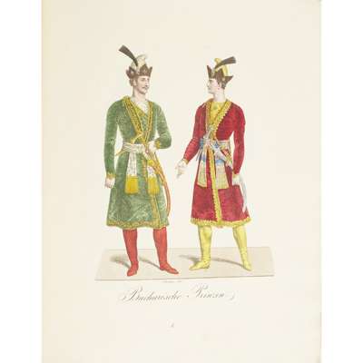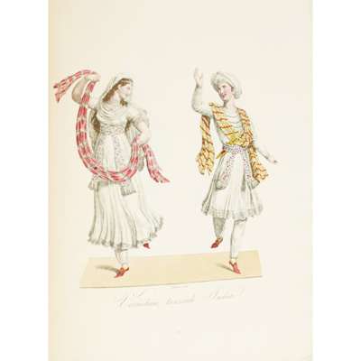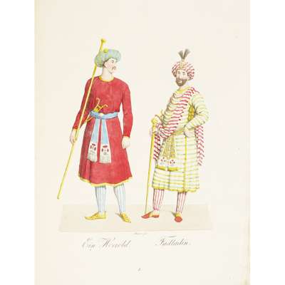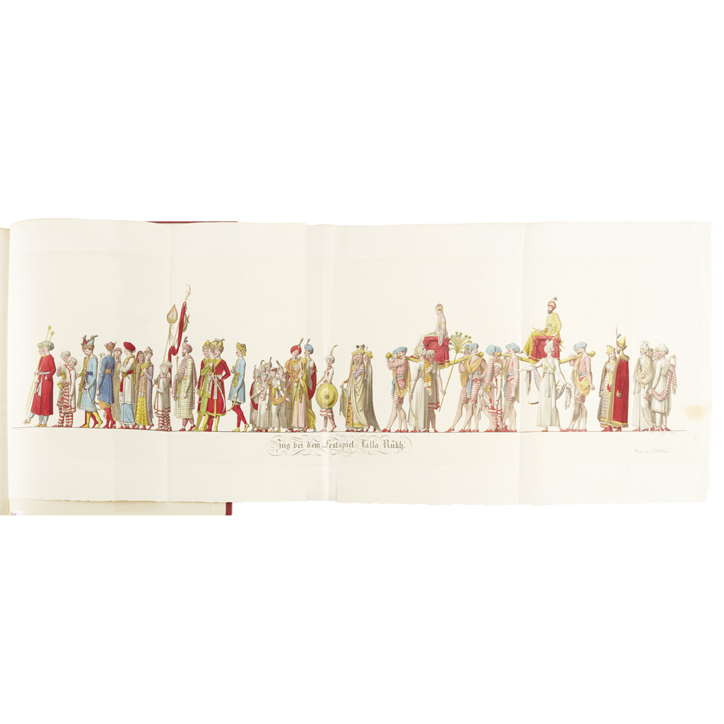 Note: A musical entertainment based on Thomas Moore's Indian romance Lalla Rookh (published in 1817), organised at the Court of Berlin to celebrate the visit of the Russian Crown Prince, later Tsar, Nicholas and his bride Alexandra on 27th January 1822. The whole court participated in the festival, with the dancers played by the cream of the Russian and German aristocracy and the role of Lalla Rûkh played by Crown Princess Alexandra. The occasion was so enjoyable that it was repeated on the 11th February. The programme and decorations were by the architect Karl Friedrich Schinkel, and the music by Gaspare Spontini, who later transformed it into a full-length opera. The costumes were designed by August von Klöber, who drew the folding plate for this book. A French edition of the work was published by Wittich in the same year. Lipperheide Sbb 25 (lacking two plates) and Sbb 26 (French edition); Vinet 777 (with 4 additional plates).