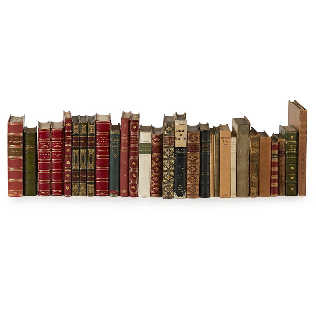 A Ride to Khiva. Travels and Adventures in Central Asia, 1877. 8vo, folding maps (1 in pocket at end), contemporary red half calf gilt; Beckford, Peter Thoughts upon Hunting. 1879. plates, red half morocco by Bickers, spine gilt, g.e; Bates, H.W. The Naturalist on the River Amazons. 1876. 8vo, plates, original pictorial cloth gilt; Hogarth, D. & Others. Great Britons. 1978, maroon half morocco gilt, g.e.; White, Gilbert The Natural History of Selborne. 1850. 8vo, green half morocco gilt; Trevelyan, G.O. The Early History of Charles James Fox. 1881. 8vo, red half morocco gilt, Andrew Carnegie bookplate, g.e.' Putnam, R. William the Silent, Prince of Orange. 1895. 2 volumes, 8vo, red half morocco gilt, Andrew Carnegie bookplates, g.e.; Shipton, Diana The Antique Land. 1950. Number 91 of 150 de luxe copies, plates, maroon morocco gilt, t.e.g.; Morton, H.V. In Search of Ireland. 1930. First edition, 8vo, green half morocco gilt; Longfellow, H.W. Poetical Works. 1910. 8vo, quarter vellum, spine gilt; Napier, Sir W. English Battles and Sieges in the Peninsula. 1893. 8vo, red morocco gilt, g.e.; Sketchley, A. Mrs Brown and King Cetewayo. [n.d.]., red half calf gilt; Teichman, Sir Eric. Journey to Turkistan. 8vo, plates, dustwrapper frayed; Woolf, Virginia A Letter to a Young Poet. 1932, original wrappers; 2o others in The Hogarth Letters Series (Peter Quennell and Rebecca West); Dante La Divina Commedia. Milan, 1828. 3 volumes, 8vo, contemporary calf gilt, spines gilt; Bell, Currer (Charlotte Bronte) The Professor. London: Smith, Elder, 1860. original orange cloth, hinges weak' and 11 others (31)