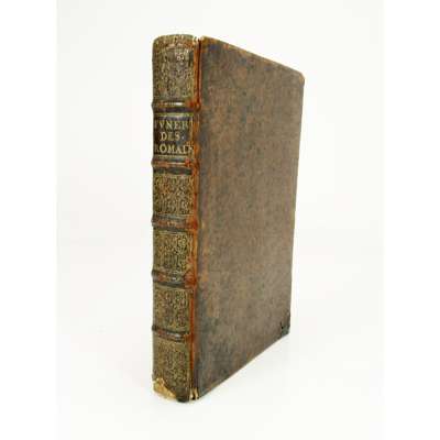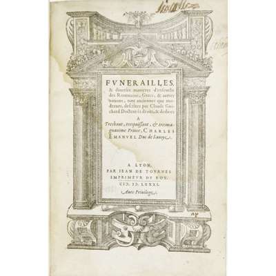 Lyon: Jean de Tournes, 1581. First edition, 4to., fine woodcut initials, engraved architectural title page, numerous wood engravings in the text of coins, grave markers, medals, ancient Roman chariot races, and an illustration of a body being prepared for burial, the dedication to Charles Emmanuel, Duke of Savoy, printed in civilité type, mottled calf, spine decorated gilt in compartments, edges rubbed, wear at head and tail of spine, water staining to the title page and first few signatures and to some signatures elsewhere in the book, early ownership inscription on the title page scored out and lower outer corner cut away