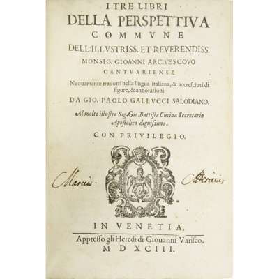 Monsig. Gioanni arcivescovo cantuariense nuovamente tradotti nella lingua italiana, & accresciuti di figure, & annotationi da Gio. Paolo Gallucci salodiano. Venice: heirs of Giovanni Varisco, 1593. First Italian translation, 4to., with woodcut diagrams in the text, contemporary vellum, early ownership inscription on the title page, some leaves discoloured, book plate of John Bury, in quarter morocco solander box