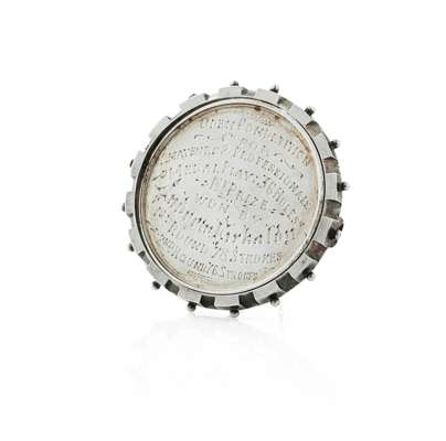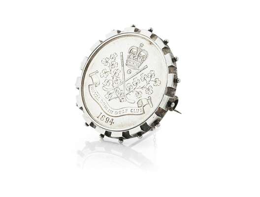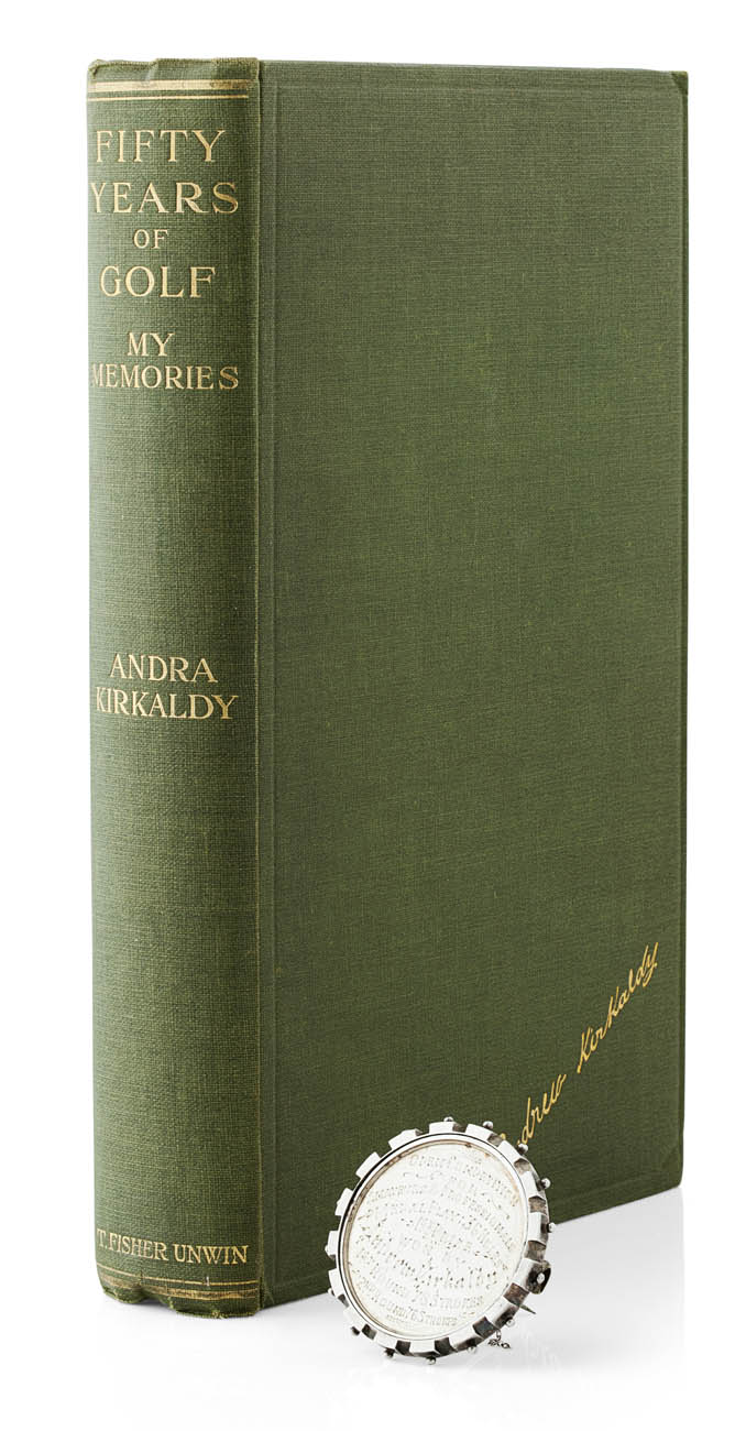 inscribed to the obverse 'Open Championship Awarded by the Royal Dublin Golf Club, 1894, for Amateurs and Professionals, Medal Play, 36 holes, First Prize, Won by Andra Kirkaldy' 1st round, 78 strokes, 2nd round 76 strokes', within a circular frame, with brooch attachment and safety chain, in a case with a copy of Kirkaldy, Andra Fifty years of golf. London, 1921. 8vo, green cloth gilt (2)