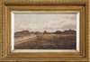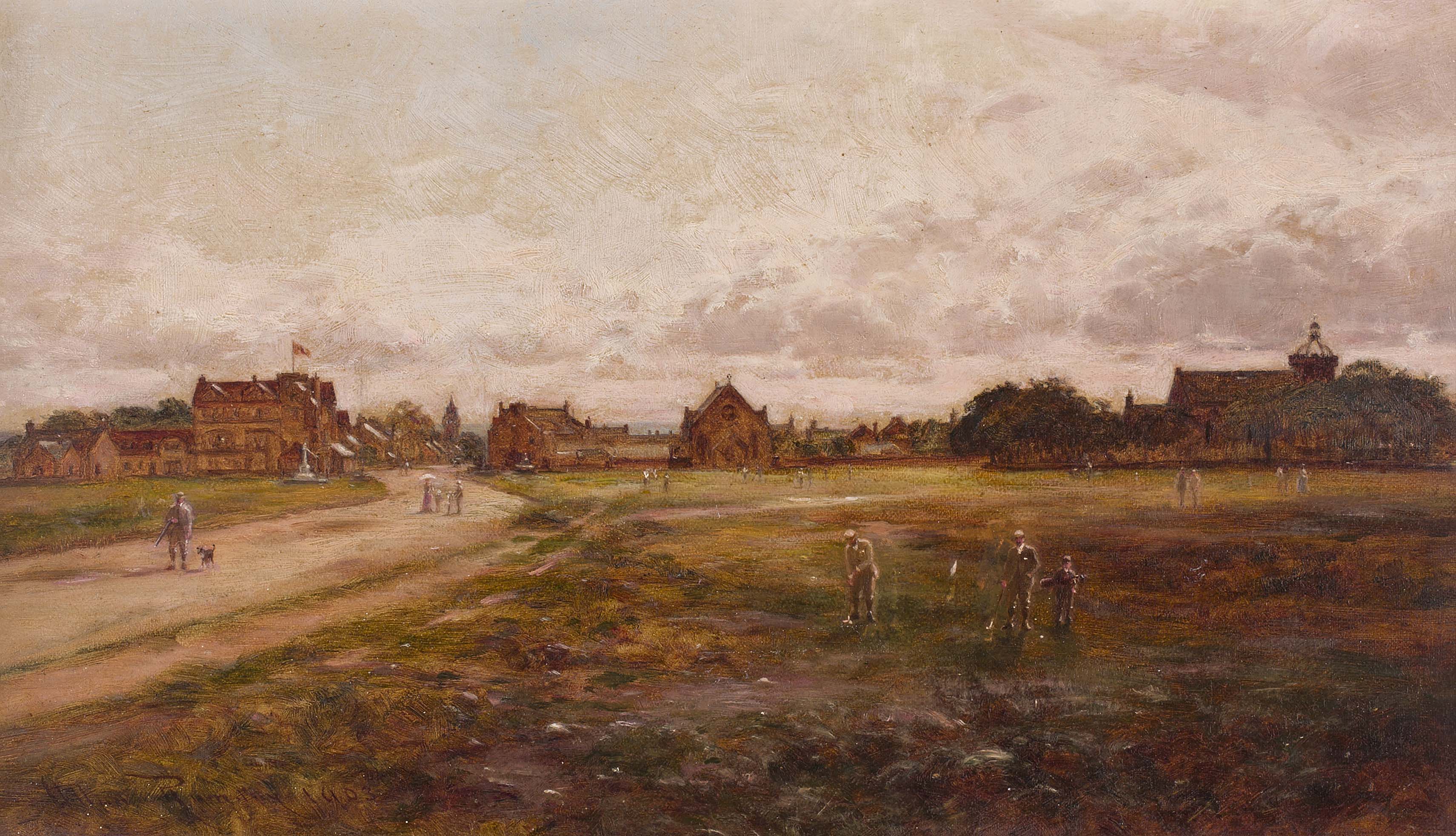 Note: This painting depicts golfers at Edzell Muir, a common ground area at the north end of the village. The Muir was used as a 9-hole Pitch and Putt course at the turn of the century and this painting is a rare example of the site's former usage.
