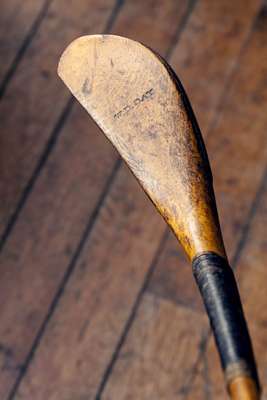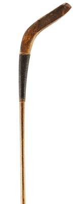 the hickory shaft with leather grip and bottom whipping, the beach head stamped W. D. DAY with a ram's horn sole insert and led weight