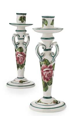 TWO 'CABBAGE ROSES' CANDLESTICKS AND A BOWL, CIRCA 1900