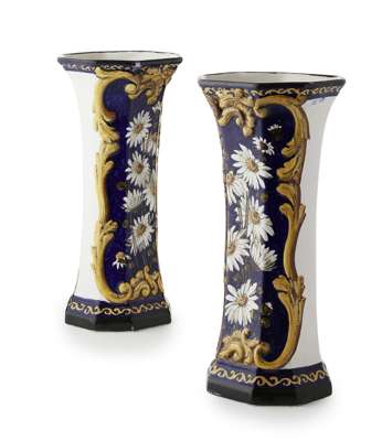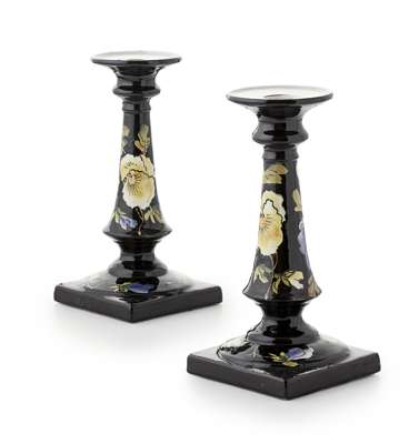 A RARE PAIR OF 'PANSIES' SQUARE-BASED CANDLESTICKS, CIRCA 1900