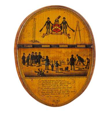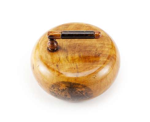 CURLING INTEREST - A BURR-WOOD AND PENWORK SNUFF MULL