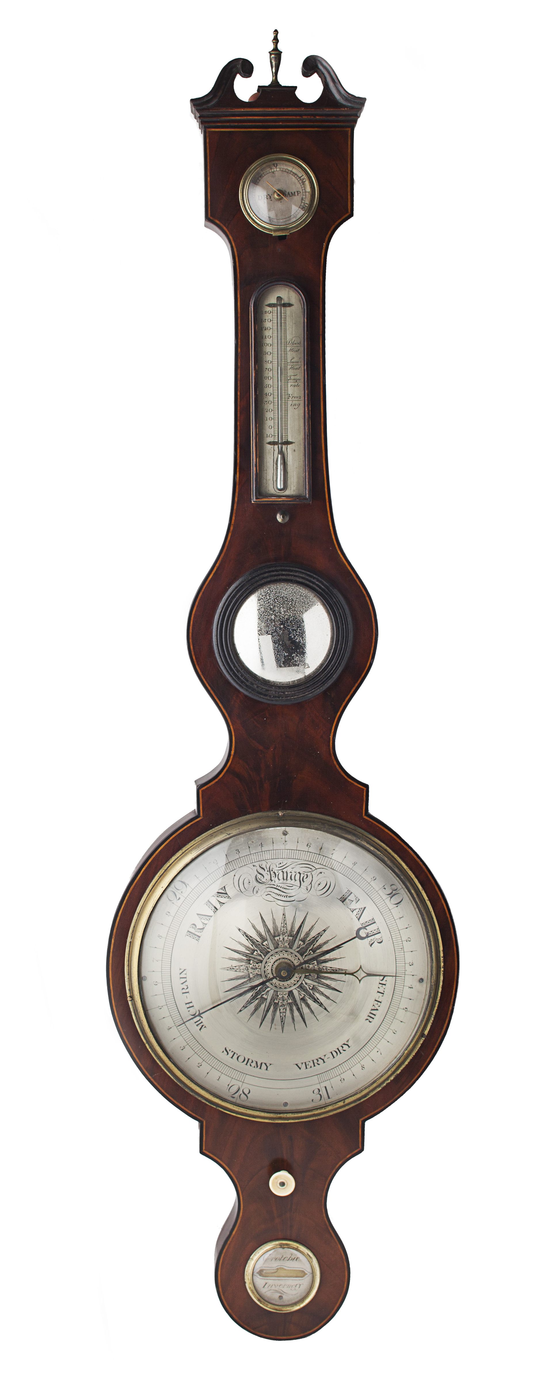 with boxwood line decoration, the swan neck pediment above dry/damp dial, thermometer, convex mirror and engraved steel dial, above ivory adjustor and level, inscribed CROTCHIE/ INVERNESS