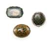 comprising a brooch of oval cabochon form with unmarked tartan panels and a simple pin closure, 7cm high; a coin purse of circular form in 'Forty-Second' tartan and a white metal frame, opening to a red leather accordion sectioned interior, 5.7cm diameter; and a shaped oval panel in 'Campbell' tartan painted with an oval reserve depicting the Palace at Holyrood, 7cm long (3)