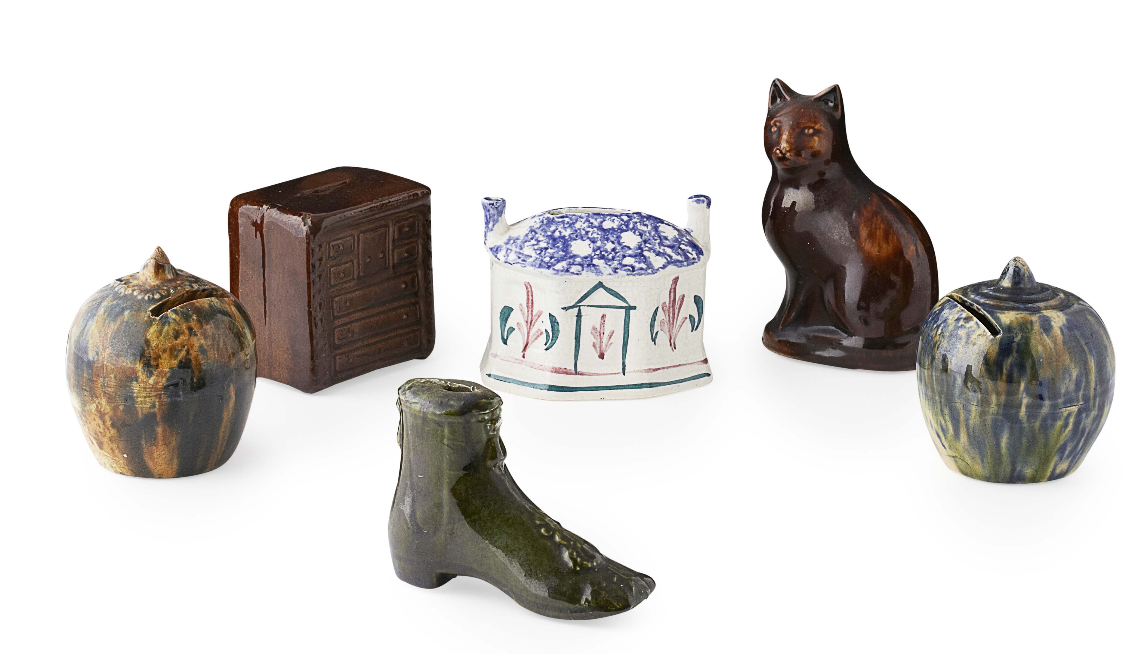 comprising a TREACLE GLAZED CAT, 12cm high; TWO 'SWEET PEPPER' BOXES, approx. 9cm high; a POLYCHROME HOUSE, 8cm high; a TREACLE GLAZED CHEST OF DRAWERS, 8.5cm high; and a GREEN GLAZED BOOT, 12cm long (6)