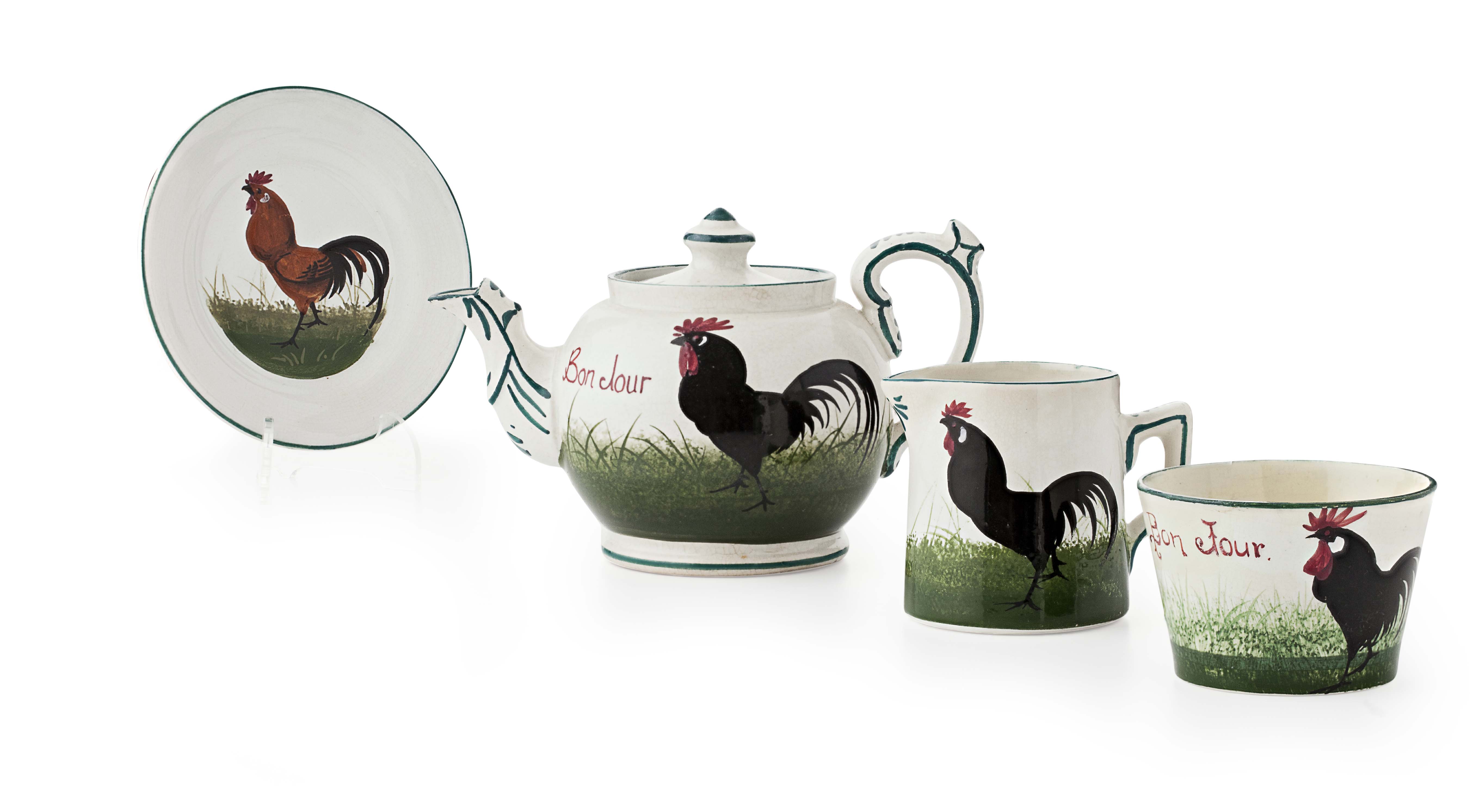 comprising a TEAPOT & COVER, painted and impressed marks WEMYSS, painted retailer's mark, 10.5cm high; SUGAR BOWL, impressed mark WEMYSS, printed retailer's mark, 5cm high; MILK JUG, painted and impressed marks WEMYSS, 7cm high, and a SMALL PLATE decorated with brown cockerel & hens, painted mark WEMYSS, 12cm diameter (4)