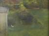 Born in Huddersfield in 1932, David Tindle studied at Coventry School of Art, and after teaching at the Royal College of Art was appointed Ruskin Master of Drawing at Oxford University from 1985 to 1987. He was elected to the Royal Academy in 1979. His work is included in collections such as the Tate Gallery, National Portrait Gallery, and the Royal Collection. Always more traditional in execution than that of many of his contemporaries, in the early 1970's Tindle's work underwent a profound evolution. Having retreated to Italy, where he studied the antique technique of tempera painting, in 1972 Tindle emerged renewed as an artist, and a master of the medium. Preparing the paint and small panels upon which he now works himself, Tindle's works are meticulous in detail, and contemplative in mood, recalling the influence of Romantic artists such as Samuel Palmer. In this painting we observe his celebration of nature, and the dappled green hues of a tranquil garden, in which only a hat abandoned on a chair points to thepleasure its owner, and also the viewer, takes in a few still moments within its walls.