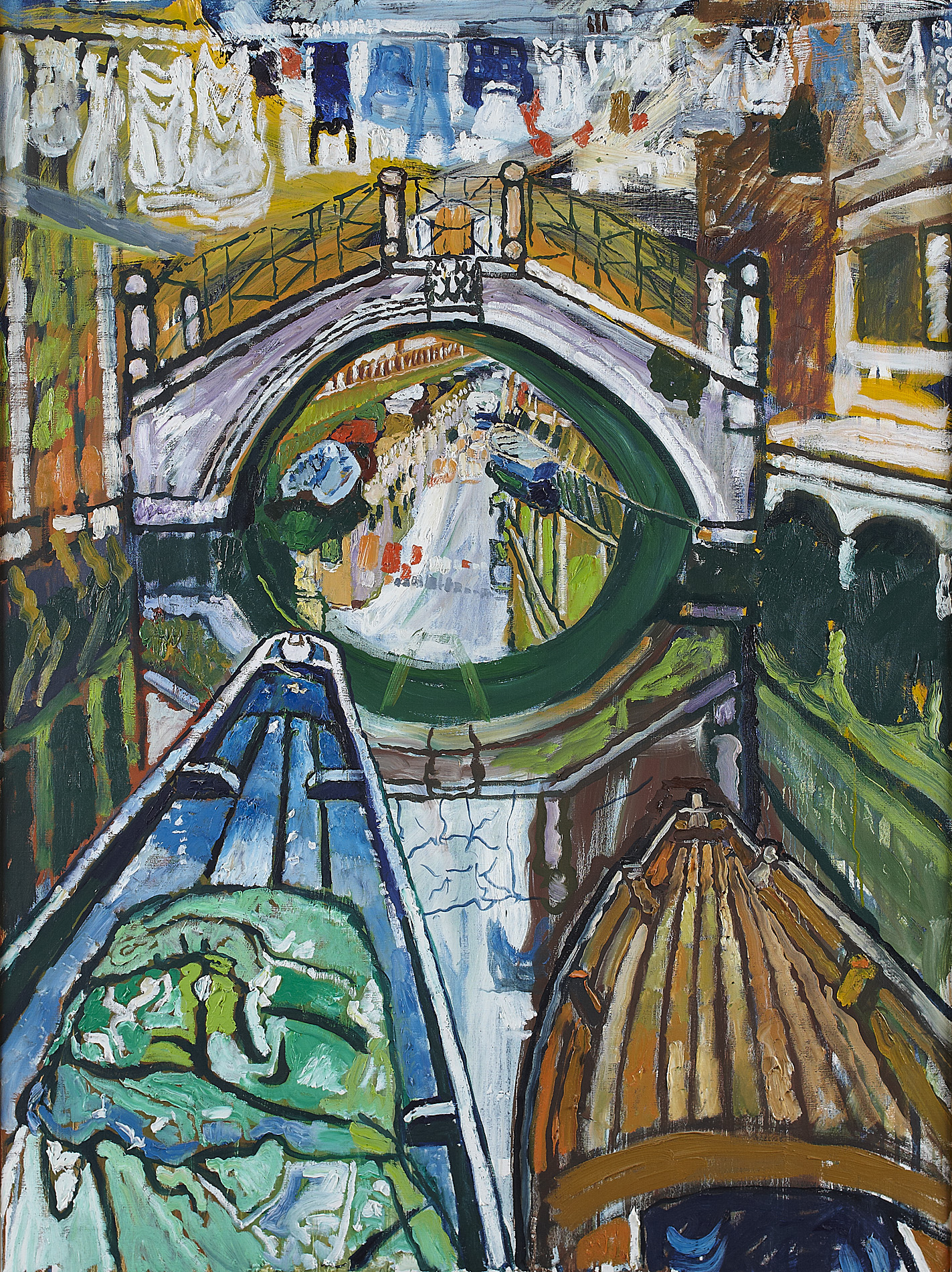 Cooke, Bratby found love again in the form of actress Patti Prime, with whom he would travel throughout the eighties, creating works such as this painting, typical of his oeuvre in its thickly-applied and vibrant-toned paint, and in its celebration, not of the architectural glories of Venice, but rather the somewhat more quotidien detail of its residents' washing stretching over a canal to dry.