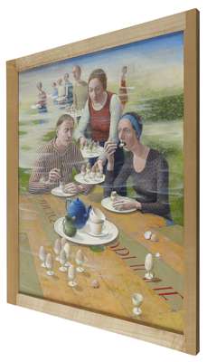 juxtapositions and a wit that borders on satire. In Carnival Fantasy, a cast of revelers gather inside a hollowed-out green pepper, gazing in inebriated awe and veneration at a girl who blithely swings above their head, while an elephant emerges inexplicably into the fray behind them. While perspective is twisted and proportion blurred, each character is delineated with precision, and flowers lovingly observed (betraying the artist's own passion for gardening). While something in this crowd of English eccentrics might echo those of Stanley Spencer, this disorientating gathering leaves us baffled and intrigued as to its purpose.
