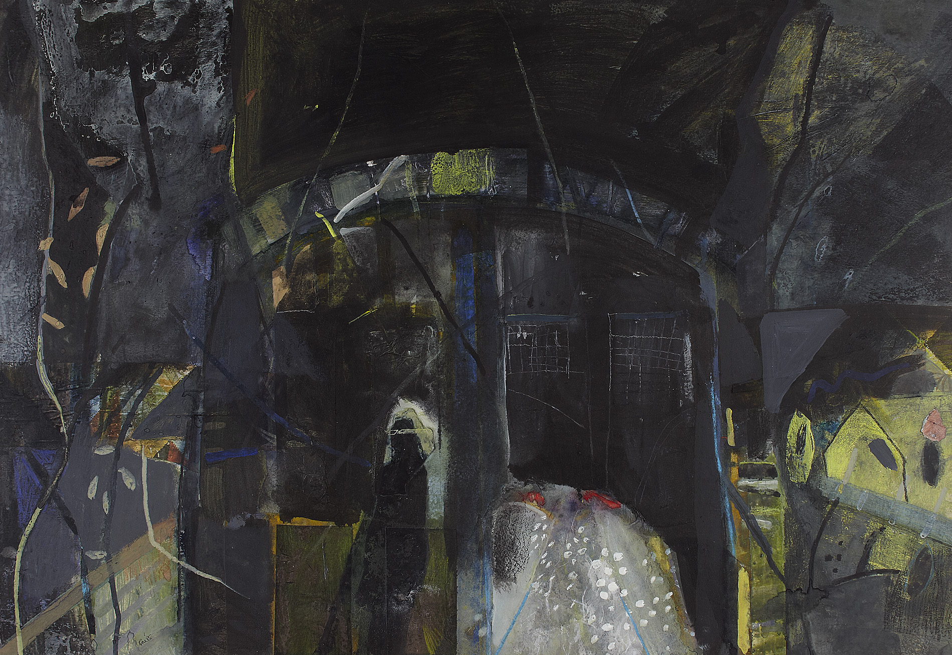 Signed and dated '85, and signed, inscribed, and dated 1985 verso, acrylic and collage on card