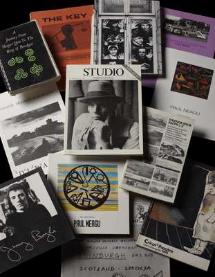 George Mackay Brown,104 letters, between 1981-1995; Joseph Beuys/Richard Demarco 7000 Oaks Project interview recorded by Jane MacAllister, 27 March 1982 at Brooks Club London, master copy cassette recording; Catalogue: Richard Demarco Archives, Through Seven Decades and Countless Locations on the Road to Meikle Seggie, year 2000; Keir Smith, 9 folding Forth Studio brochures, Keir Smith, The Coniston Variations, 1983; Forth Studio catalogue: Catalogue Designs 1990-1996; Catalogue: Demarco on the Road to Meikle Seggie; Catalogue: Demarco on the Road to Meikle Seggie, Philosophy; Catalogues: Peter Lloyd Jones, Michael Tyzak, Pat Douthwaite, Experimental Poetry, Ritzi Jacobi, Paul Neague, Ion Bitzan, Edinburgh Arts '75; Ian Hamilton Finlay. Book: Images from the Arcadian Dream Garden, Christmas 1992, Little Sparta, accompanied by small white embossed card - Swans in Winter, Snow on the Snow of their Wings, inscribed "Happy Christmas from Ian"; Ian Hamilton Finlay. Book: A Book of Wild Flowers, illustrated by Gary Hincks, Wild Hawthorn Press, accompanied by card: The October coloured sails of old Thames barges, The water filled footprint of old Thames barges, The cold Christmas stables of old Thames barges, The Georgian pastorals of old Thames barges, signed "Happy Christmas, love from Ian", Little Sparta, Christmas 1994; Ian Hamilton Finlay. Book: Unsigned, designed by Pia Maria Smig, Christmas 1995, edition of 250 copies, Wild Hawrthorn Press, accompanied by card: Pines in the Snow, TAKRL.., signed on back "Happy Christmas from Ian, as ever, XX"; Trevor Yerbury. Mounted photos of MacAllister-Dukes wedding in Demarco Gallery; Hugh Collins, letter 1983, while in Special Unit, describing the process of making the Christ and the Sinner statue; Seamus Heaney, postcard, 1986: 'Poland deserves Iceland'; Tom Bakewell, drawing of Marques, unsigned, [25.5cm x 18.5cm]; Jeanine Osborne, drawing, 1991; Richard Demarco. 'Furling Sail by Moonlight', number 33 of 60, 1991; Richard Demarco. 'Full Sail Towards Eynhallow from Stromness', number 36 of 60, 1991; Richard Demarco. 'Unfurling Sail towards the Gairloch', number 39 of 60, 1991; Douglas Swan. 'A wee scratchy phone in the night, from Douglass with love to Jane", etching, unframed, [21cm x 20cm]; Zbigniew Mackariewicz. 1984. 'Scottish Inspirations' (nominated), 134 Portfolio, dedicated to Jane MacAllister by Zbiggy MacArewych, Wroclaw, Poland; Richard Demarco. 'Tall Ships Passing Cruden Bay', number 22 of 60, 1991; George Wyllie. Paper Boat Indentation certificate for Justin and Jane, signed by George and Daphne, 'Shipmates', 1990; Paul Neagu. Flying Horse, number 68 of 75, signed "Neagu P.", c/o GAG 1974, rolled in a decorative cardboard tube with inscription by Paul; Timothy Emlyn Jones, 'The Secret Box', 1995, ink drawing.
