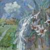 LILIES BY A WATERFALL WITH DISTANT CLOUDBURST