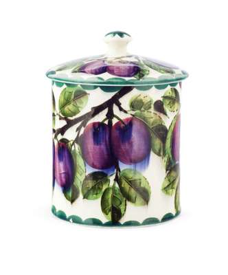 LARGE 'PURPLE PLUMS' PRESERVE JAR & COVER, CIRCA 1900
