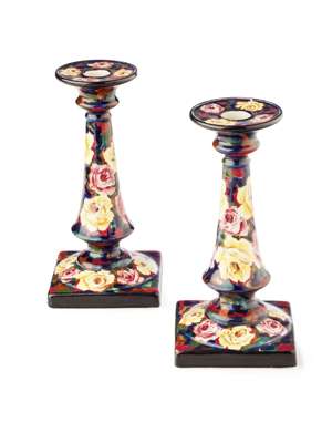 RARE PAIR OF 'CABBAGE ROSES' SQUARE BASED CANDLESTICKS, EARLY 20TH CENTURY